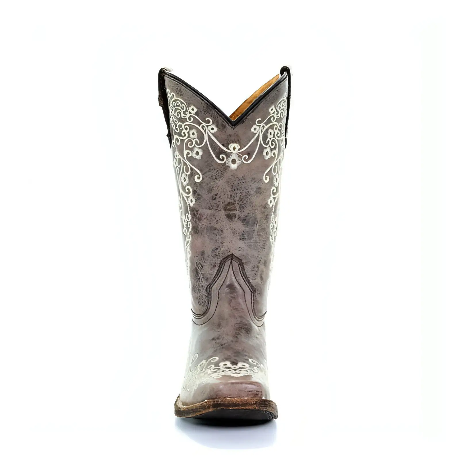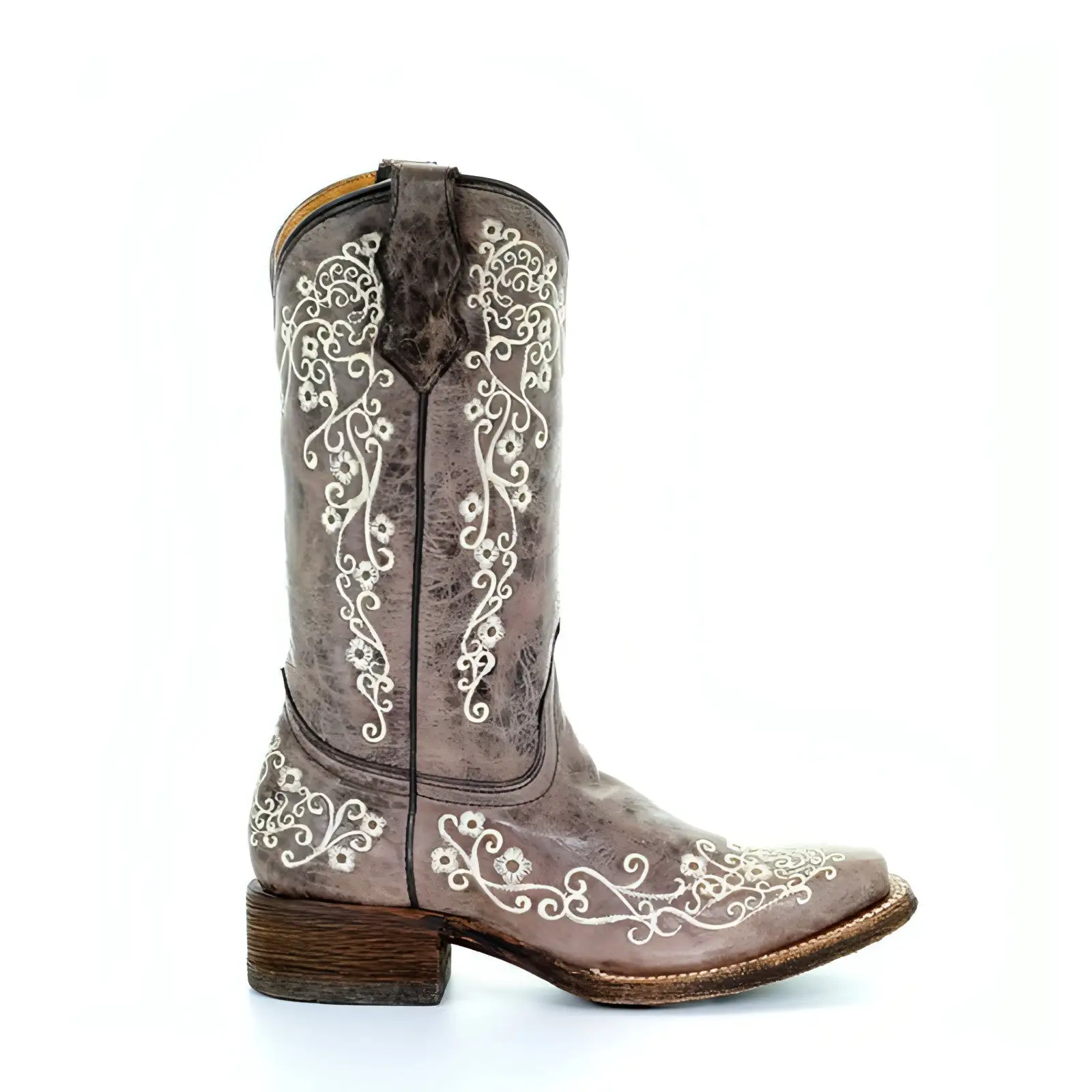 Teenโs Brown Crater Bone Embroidery Square Toe – One of our most popular square toe boots features a gorgeous contrast between the lace delicacy of embroidery against the rustic leather. A classic for any occasion.