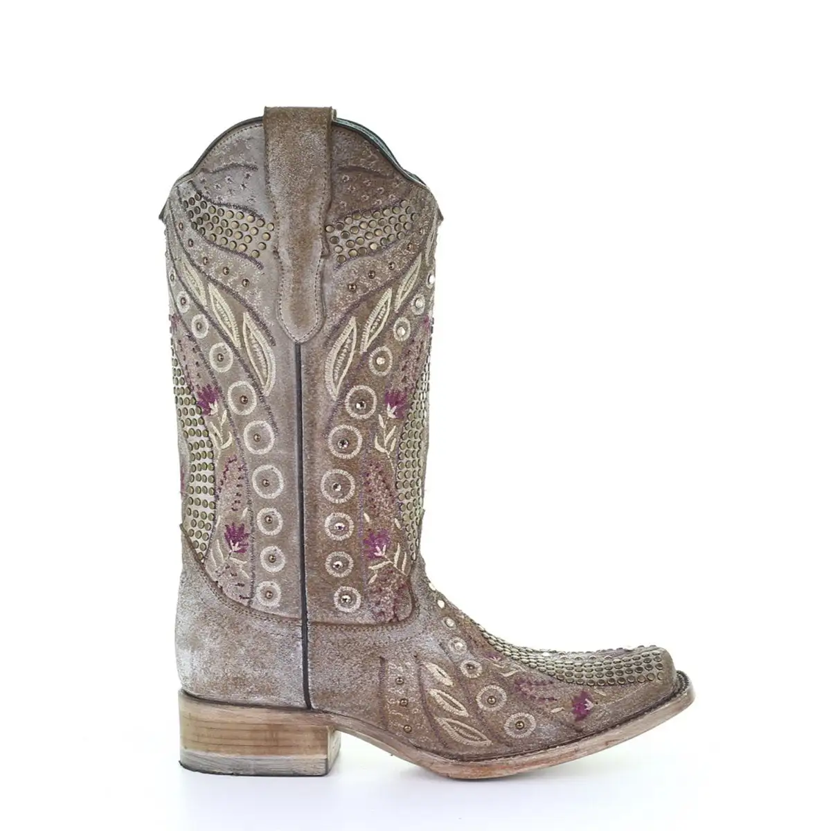 Check out this gorgeous Corral boot! This boho/vintage inspired boot features an aged leather look with beautiful mauve floral embroidery, studs, and crystal detail throughout the footbed and shaft. It is hancrafted by more than 90 artians who guarantee its prolonged useful life.