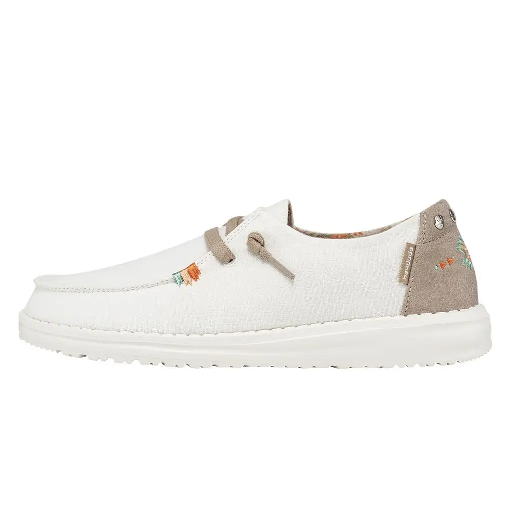 Washed cotton materials, crochet embroidery, and hand-stitched details come together for a customized look. The Wendy Ranch collection features Hey Dude’s easy-on system with cotton laces and an ultralight EVA outsole to keep it comfy. Showcasing contrasting textures and hand-stitching at the heel. So festival ready.