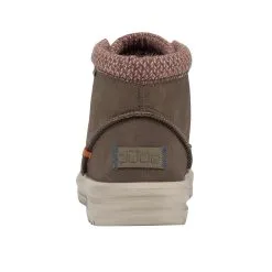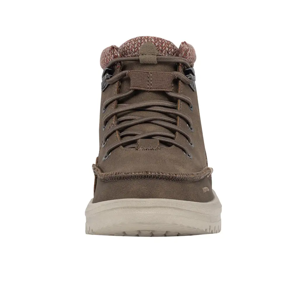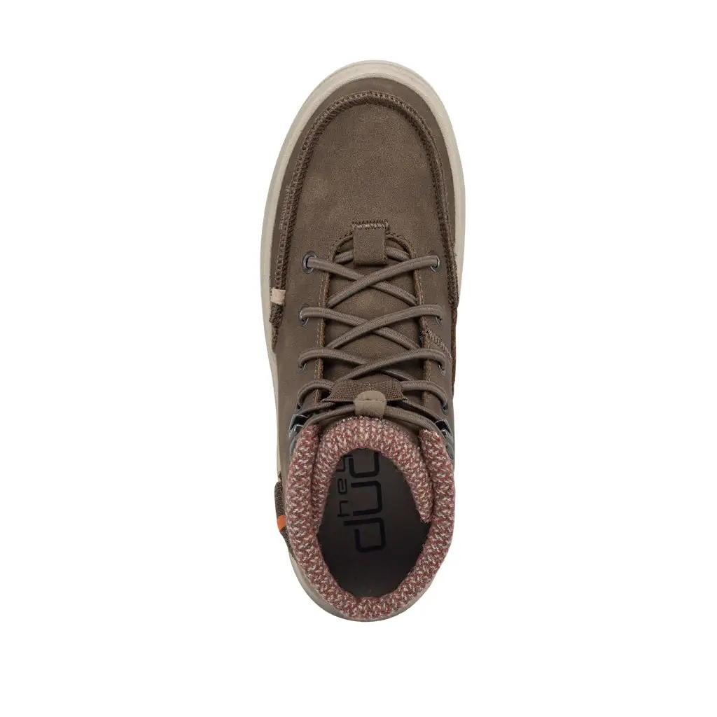 Introducing the slip-on moccasin boot. It only looks hefty. Surprisingly lightweight and cushy. In rugged, water-repellent recycled leather with a soft and breathable wool lining. Hey Dude’s smart elastic lacing system means you just pull, hook, and go.ย