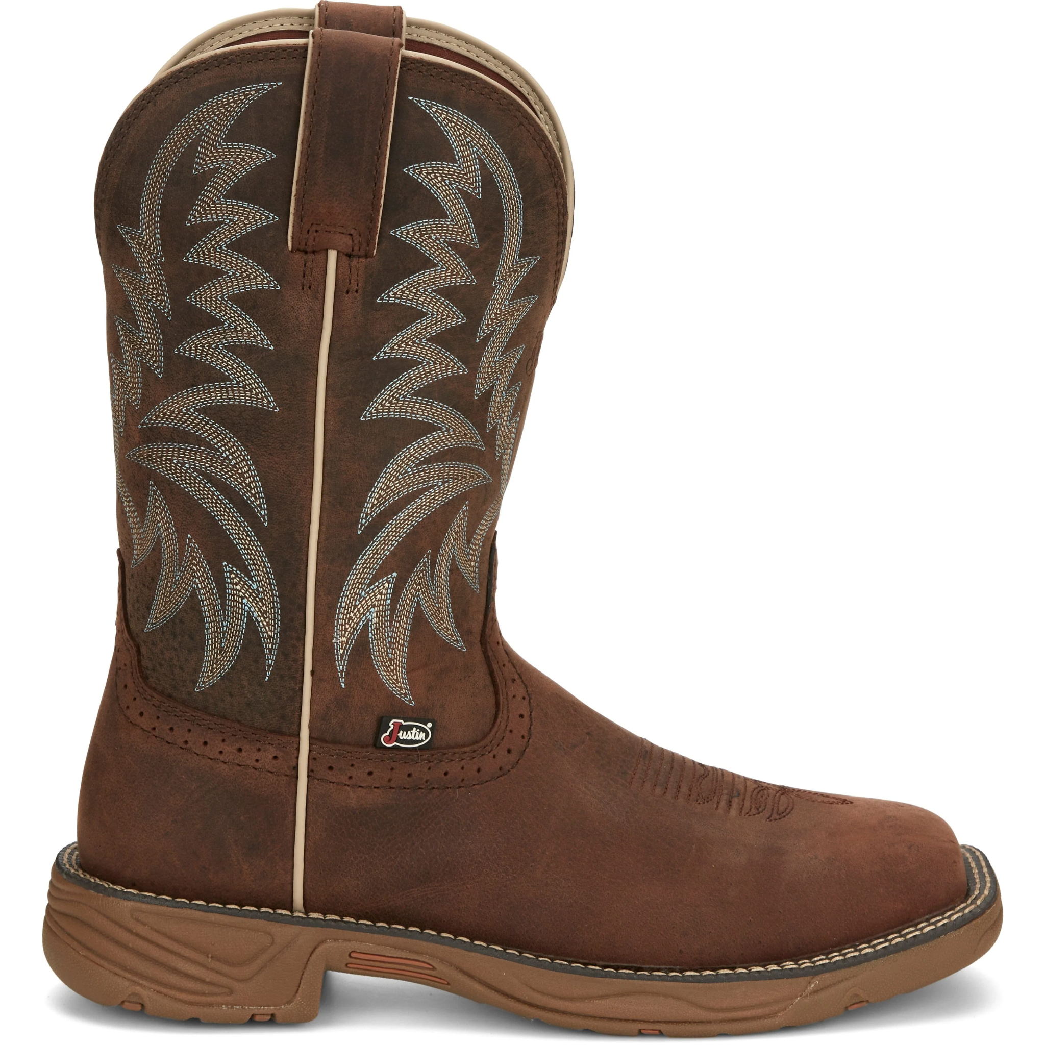 The 11” Stampede Rush Wide Square Toe boots in Hickory Brown feature a strong athletic build that provides comfort and flexibility with each and every step. The wide square toe leaves your feet with plenty of room, while the removable OrthoLite® insole will keep your feet comfortable all day long. The oil- and slip-resisting rubber outsoles will keep you steady on your feet no matter what the conditions are like.