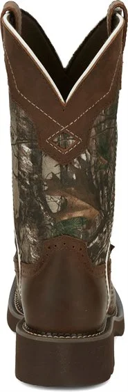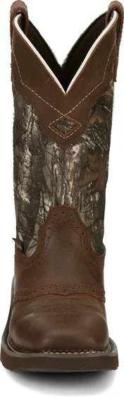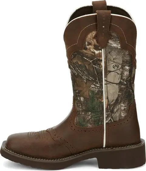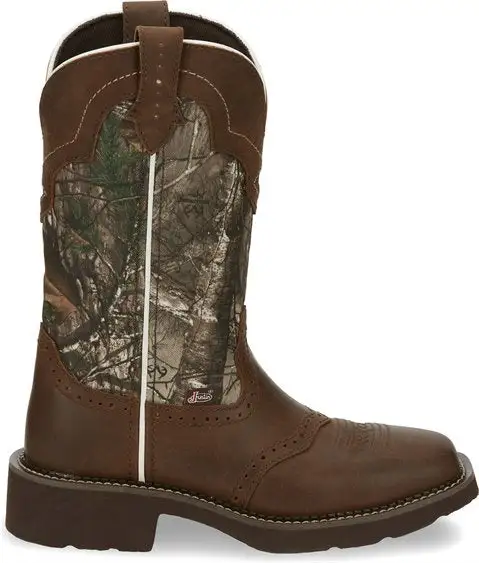 Hunt in style in the 12-inch tall Raya Camo Justin Gypsy Women’s cowboy boot. Featuring a RealTree Xtra camo upper with a brown leather scalloped collar and matching brown foot, this boot effortlessly combines femininity and function. The simple white seam on the quarters and diamond cut pull straps are subtle details that give this cowgirl boot an edge. The square toe and unit heel provide a relaxed fit and the J-Flex Flexible Comfort System insole with removable orthotic inserts promises comfort no matter where the trail takes you.