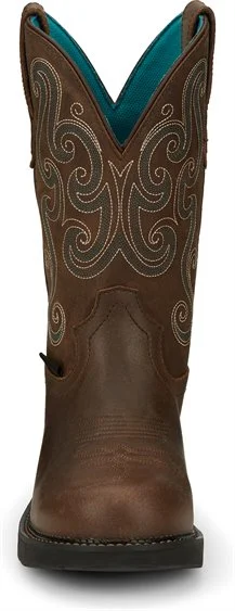The Tasha Steel Toe women’s Justin Gypsy work boot steps on the wild side with chocolate chip brown leather and a turquoise and cream stitching on the shaft.ย The interior is not only made for comfort with the J-Flex Comfort System insole, its subtle topaz lining adds elegance. The Gypsy round steel toe is both feminine and provides added protection while the injected shank allows for additional support. These boots were made for walking, and definitely made for working.