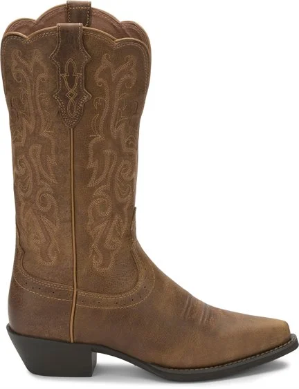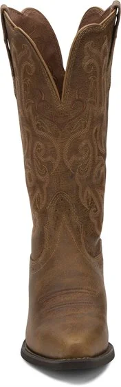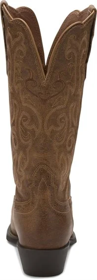 The McKayla Tan 12″ tall Women’s Stampede western boot is a wardrobe necessity.Β The golden tan leather exterior has a lived-in look is embellished by a subtle brown stitch pattern and its scalloped collar is a subtle feminine detail. The perforated saddle foot features a narrow toe and elevated heel give this boot a fashionable edge and the J-Flex Flexible Comfort System insoles with removable orthotic inserts guarantee comfort. This boot also features the Justin Stabilization Technology that uses dual density medical memory foam to stabilize the foot while still allowing it to move as needed.