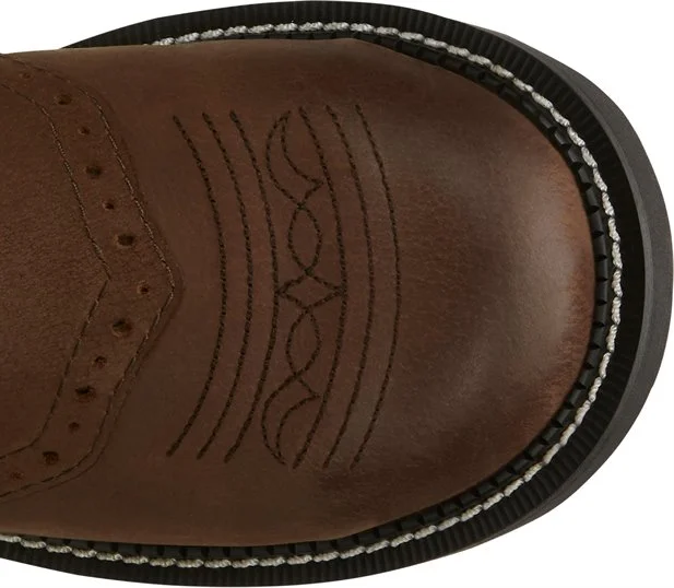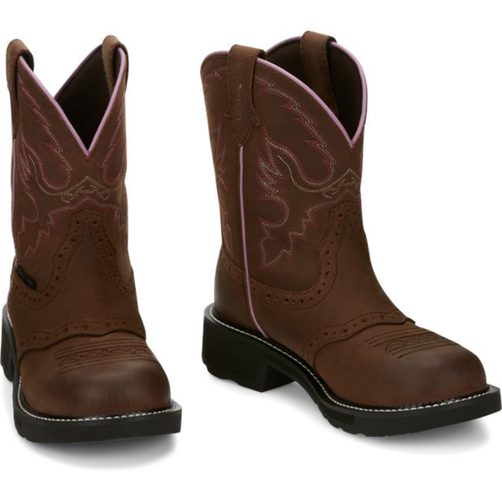 The Wanette Chocolate Brown Steel Toe is an 8″ tall Women’s Justin Gypsy™ work boot that looks as good as it feels. Its built for a comfortable and relaxed fit with a rugged golden brown leather exterior decorated by a delicate pink and white stitch pattern on the upper. The light pink seam on the quarters, trim on the collar, and peek-a-boo cutouts on the diamond cut pull straps add a subtle feminine touch. This boot also features a round steel toe for added protection and the J-Flex Comfort System® insole that cushions and supports the foot guaranteeing lasting comfort in or out of the saddle.