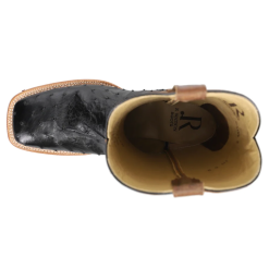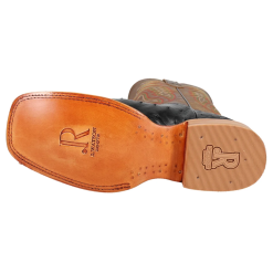 R. Watson presents these black full quill ostrich and mad dog tan cowhide exotic western boots. These boots have a 10 row stitch pattern, R. Watson comfort system, all leather stacked heel, counters, solid steel shank, and 10 iron outsole. 13″ total in height.