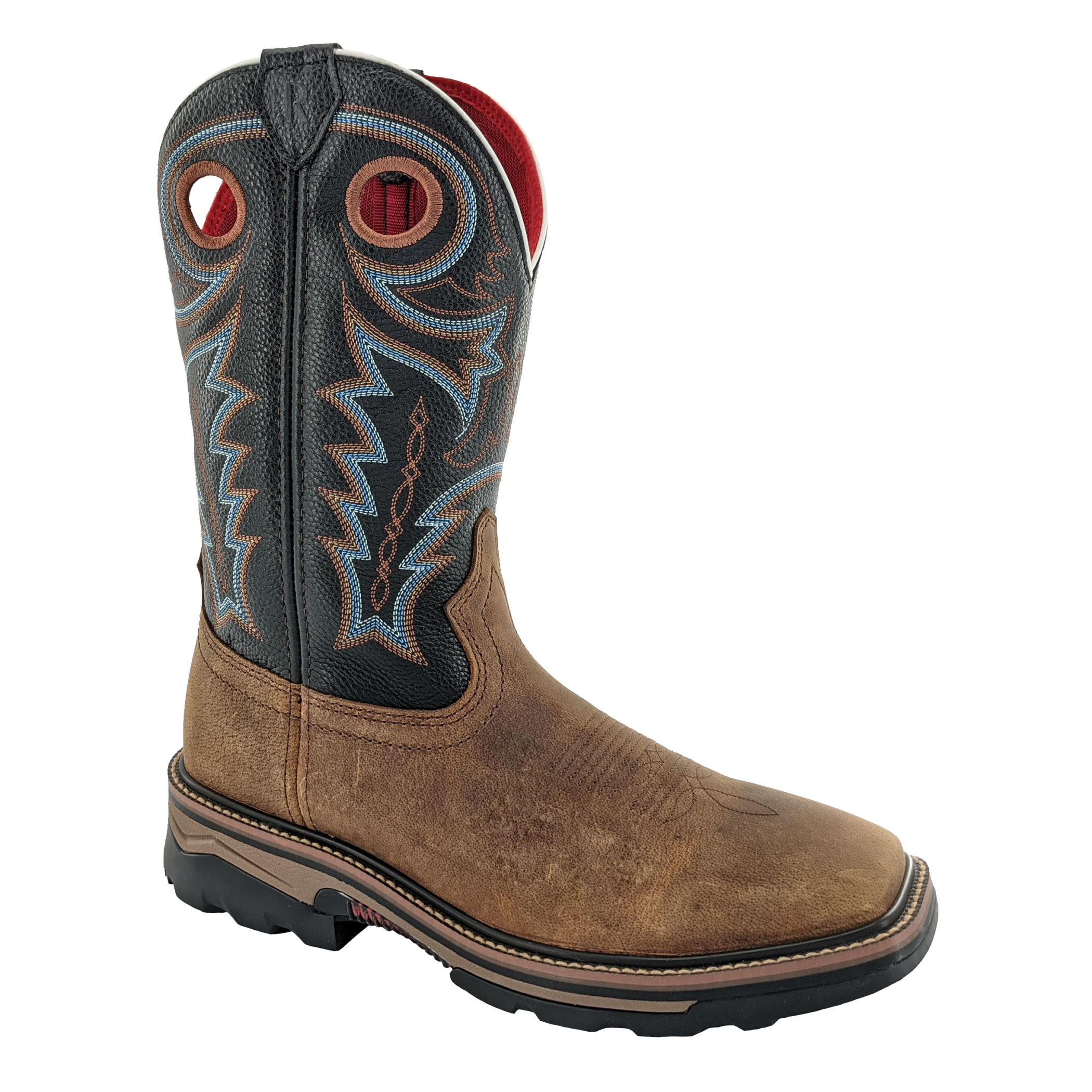 R. Watson presents these coffee distressed buffalo and midnight black cowhide square toe work boots. These work boots have a 10 row stitch patter, pull holes, removable orthotic insole, EVA midsole and a block heel. They are EH, slip and oil resistant. 12″ total in height.